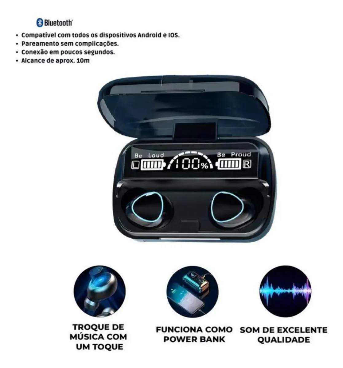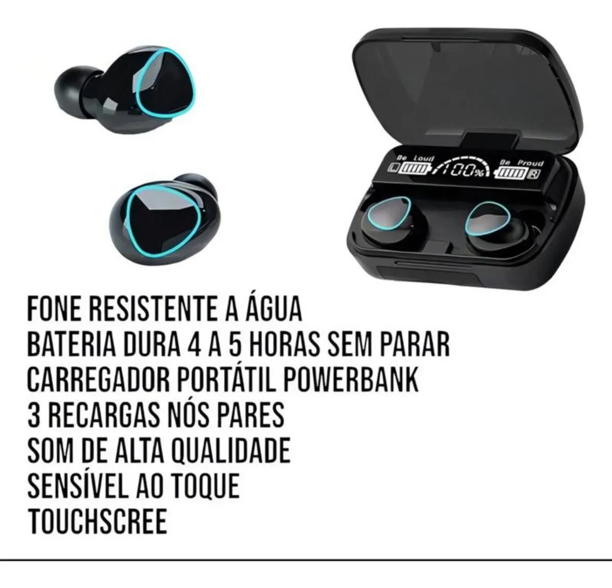 O Fone M10 TWS redefine sua experiência de áudio sem fio com tecnologia de ponta e design ergonômico. Equipado com Bluetooth 5.1, redução de ruído digital CVC8.0 e resistência à água IPX7, ele é perfeito para uso diário, exercícios físicos e viagens. A case de carregamento com capacidade de 2000mAh funciona como power bank, garantindo autonomia extra para seus dispositivos. Destaques Principais: Bluetooth 5.1: Conexão estável até 10m, baixa latência e compatibilidade com iOS/Android/TVs Redução de Ruído CVC8.0: Isola ruídos externos, garantindo chamadas claras e música sem interferências IPX7 À Prova d’Água e Suor: Ideal para treinos e atividades ao ar livre Controle por Toque: Navegue entre músicas, atenda chamadas e ajuste volume com toques simples Power Bank Integrado: Case com 2000mAh recarrega os fones até 2 vezes e outros dispositivos via cabo Especificações Técnicas Característica Detalhes Versão Bluetooth 5.1 (2402 MHz ~ 2480 MHz) Redução de Ruído CVC8.0 Resistência à Água IPX7 (à prova d’água e suor) Autonomia – Música: 2-5 horas por charge – Case: Recarrega os fones até 2 vezes Bateria – Fones: 50mAh cada – Case: 2000mAh (funciona como Power Bank) Tempo de Carregamento – Fones: 1 hora – Case: 2-3 horas (via cabo USB) Distância de Conexão Até 10m Controle Toque (pausa, troca de música, chamadas) Conteúdo da Embalagem 1 × Par de fones de ouvido TWS 1 × Case de carregamento (2000mAh) 1 × Cabo de carregamento USB 1 × Manual do usuário (em português) Q: É compatível com iOS e Android? A: Sim, funciona com qualquer dispositivo com Bluetooth (smartphones, tablets, TVs, notebooks). Q: Posso usar apenas um fone ou conectar em dois dispositivos? A: Sim, pode ser usado individualmente (modo mono) ou conectado em dois aparelhos diferentes simultaneamente. Q: Como identificar o lado esquerdo e direito? A: Os fones possuem marcações “L” (esquerdo) e “R” (direito) na parte interna. Q: Tem como controlar a música pelo fone? A: Sim: Toque 1x: Pausa/Play Toque 2x (direito): Próxima música Toque 2x (esquerdo): Música anterior Q: A case pode recarregar outros dispositivos? A: Sim, conecte seu celular ou aparelho via cabo USB na case (funciona como Power Bank). Observações Importantes Todos os produtos são testados e verificados antes do envio. A resistência à água não inclui mergulhos prolongados. Mantenha a case fechada quando não em uso para preservar a bateria.
